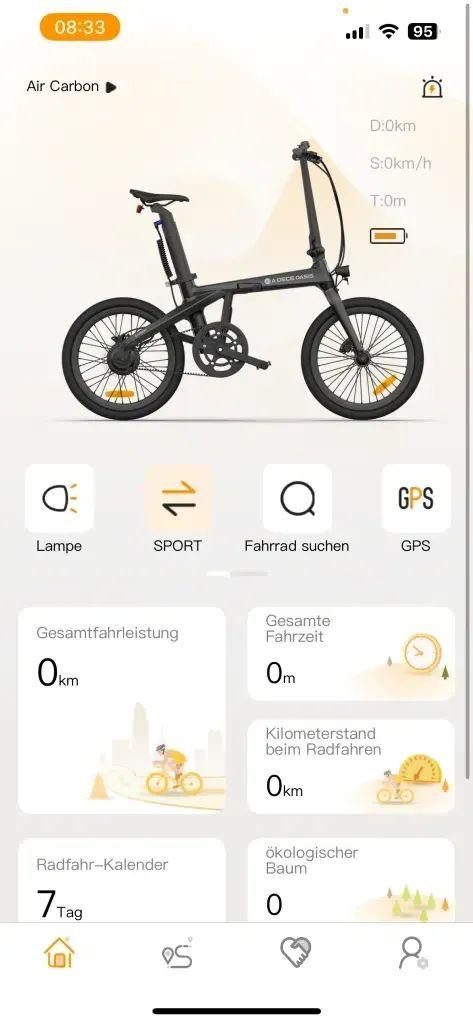 ADO Air Carbon的智能化设计是其一大亮点。通过与ADO应用程序的连接,用户可以轻松实现多种功能。下载适用于Android或iOS的应用程序后,通过蓝牙连接电动自行车,即可解锁各种设置选项,例如开关车灯、切换Eco和Sport模式等。借助内置的GPS模块和4G蜂窝连接,应用程序还可以显示电动自行车的当前位置,为防盗和定位提供了额外的安全性。